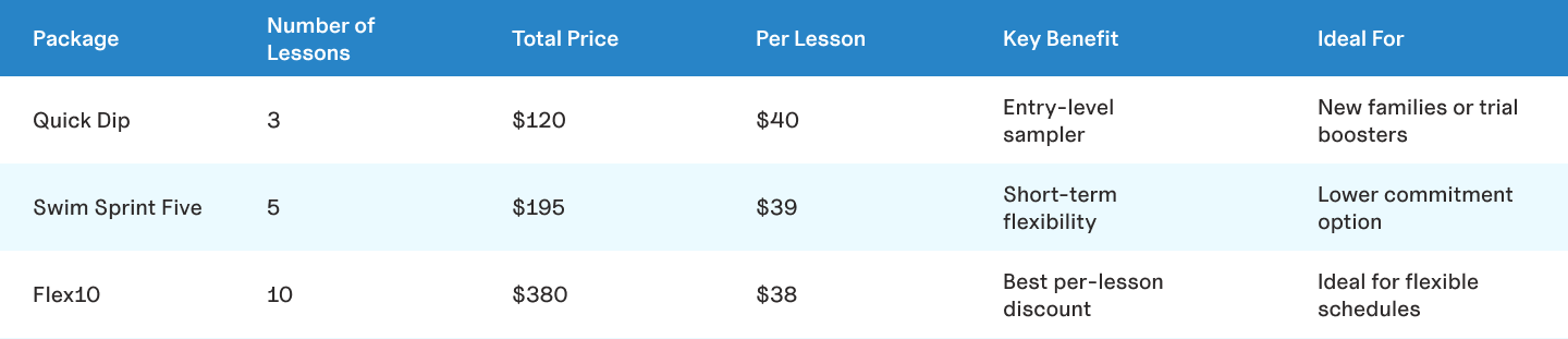 Little Fins offers Swim & Save in multiple package sizes, allowing you to choose the number of lessons that fits your timeline and budget. Each package provides private, one-on-one instruction at a discounted rate compared to standard single-lesson pricing. The more lessons you purchase in a package, the greater the savings per lesson.