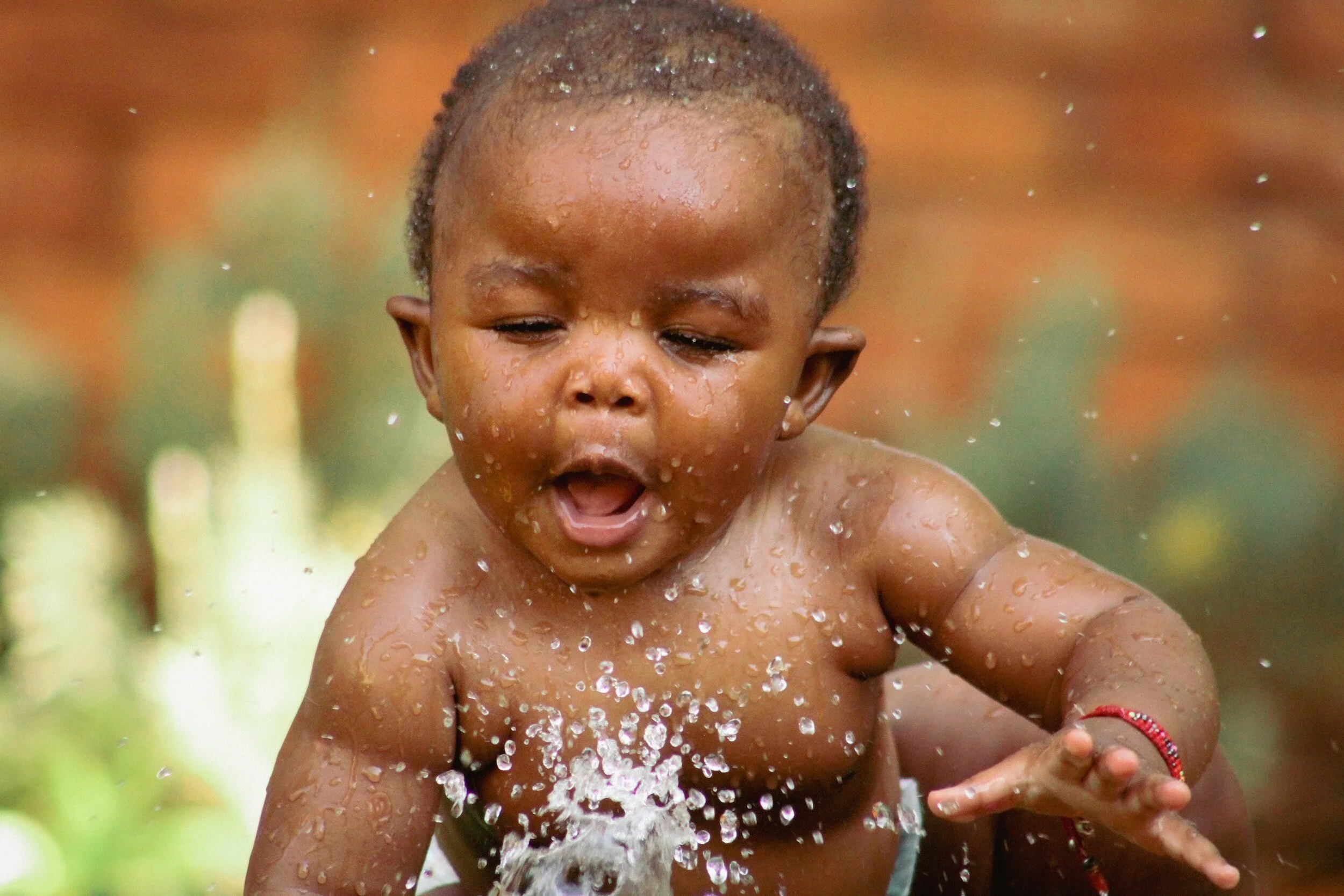 playing with a garden hose or sprinkler, encouraging “fun” water play;