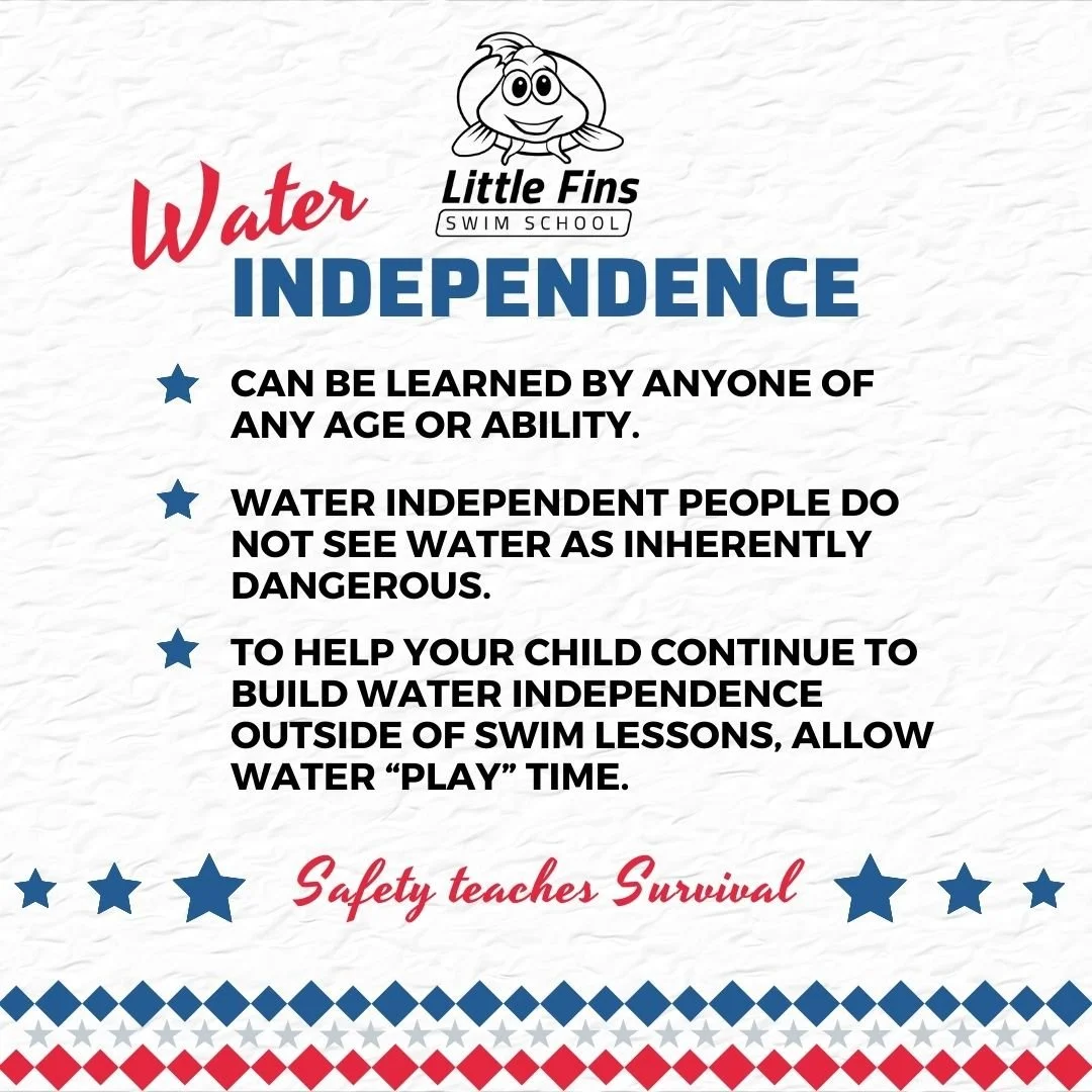 Water independence is critical to becoming “water safe.” Work with your family members to create an atmosphere of respect and love for the water, and you will be sure to have water independent swimmers. When some can move in multiple strokes or just hang out and do nothing but float in the water, you know that they are “comfortable” in the water, this is water independence.