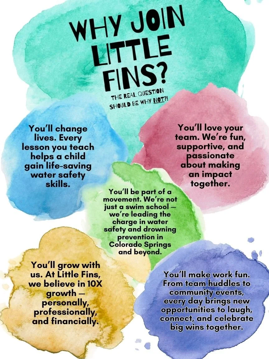 At Little Fins Swim School, we do more than teach kids how to swim — we save lives. Our team is passionate about water safety, child development, and creating a positive, fun learning environment. We are a values-driven company that invests deeply in our people. If you’re looking for “just a job,” we’re not the place for you. If you’re looking for a mission, a team, and a culture you can grow in — welcome to Little Fins.