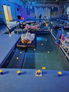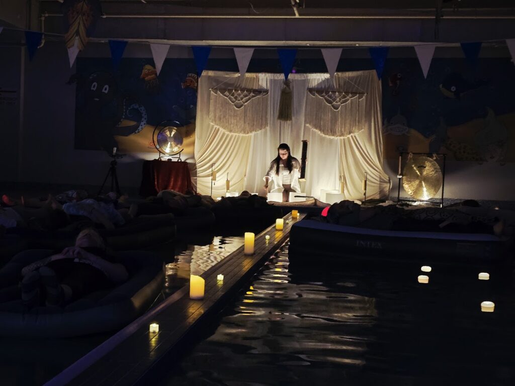 This floating sound bath takes place at Little Fins Swim School in Colorado Springs, in a warm, indoor pool designed for comfort and relaxation.
