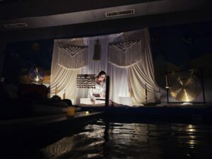 A floating sound bath is a deeply relaxing experience where you rest on a floating hammock or air mattress while calming sound waves are played around you. At Little Fins, this takes place in a warm pool, allowing your body to fully relax while sound healing helps calm your nervous system.